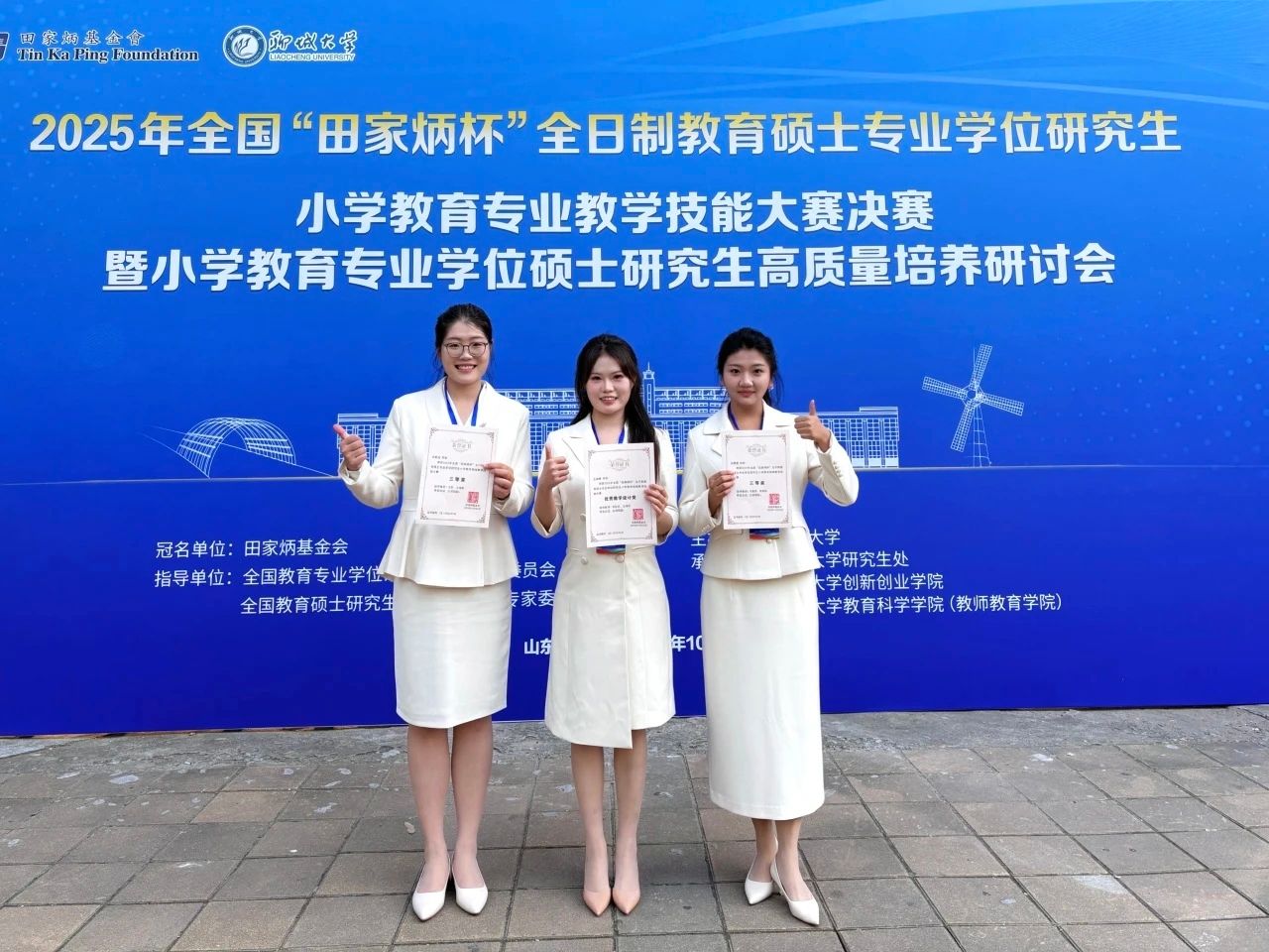 10月24日至26日,2025年全国“田家炳杯”全日制教育硕士专业学位研究生小学教育专业教学技能大赛决赛在聊城大学成功举办。学院教育硕士(小学教育)研究生王凯沄和王雅雯两位同学荣获三等奖,王海婷同学荣获优秀教学设计奖。