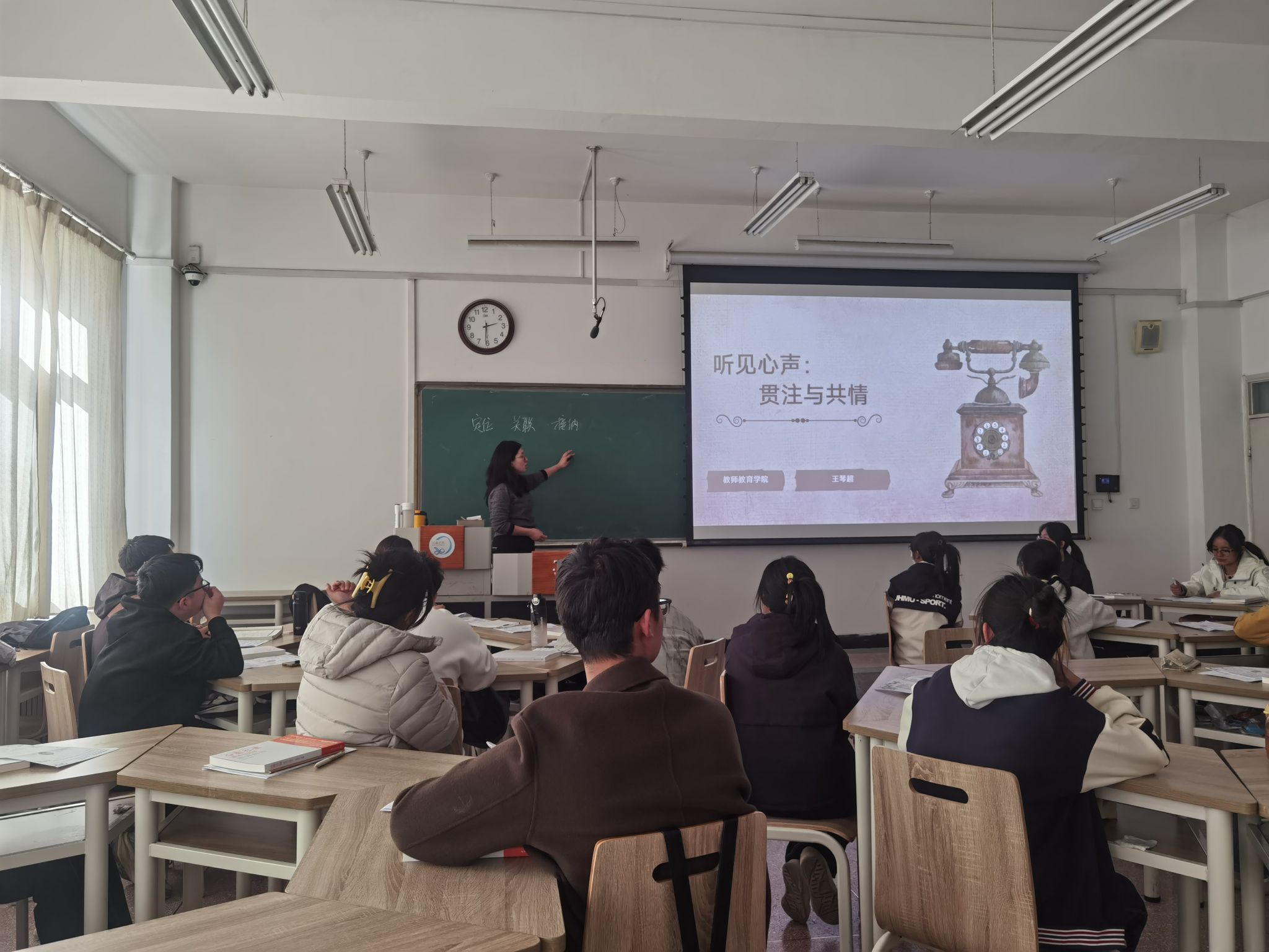 首先,心理学教研室王琴超老师上了《心理咨询技能训练》公开课。王老师教学目标明确,教学课件设计精美,在教学过程中灵活运用多种教学方法,充分调动了学生学习的积极性和主动性。其次,王老师在教学过程中能够贯彻“学生中心”基本理念,在教学过程中启发学生积极思考,引导主动参与课堂教学,教学效果显著。